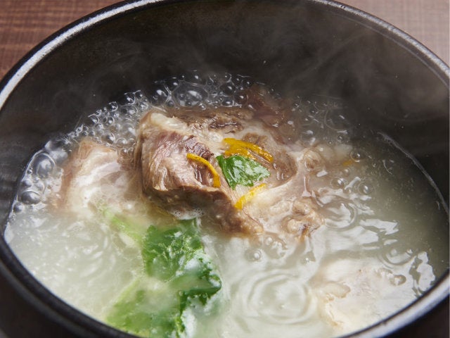 焼肉だけでなく、サイドメニューも充実。前菜におすすめの「飲むもやしナムル」(写真下)は、もやしでだしをとったあっさりスープに、食感を残すべくサッと茹でたもやしで作ったナムルが浸された爽やかな一品。ガッツリと肉を食らう合間の箸休めとしてもぴったりだ。