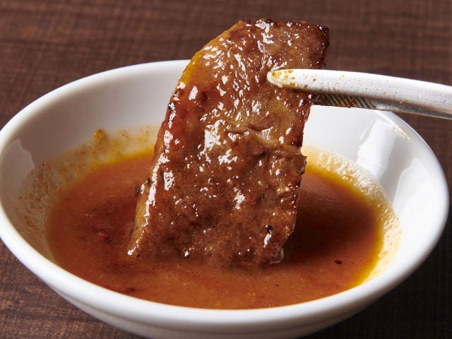 「肉に負けず、かつ味噌ダレとも相性のいいものを探し続けてようやくコレというものに出合えたんです」というポン酢は、肉のうまみをしっかりと引き立ててくれる名わき役。味噌ダレと交互に楽しめば、味覚のリフレッシュにもなりそうだ。
