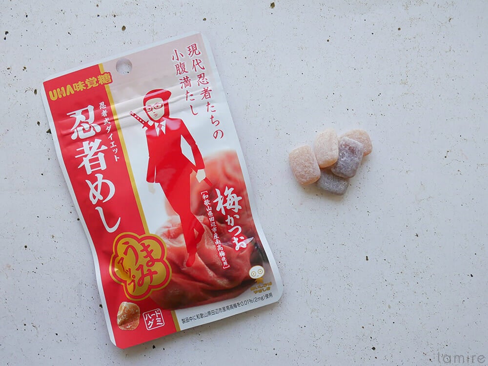 永遠に口の中からいなくなることがない「忍者めし」。ほんのり感じられる梅とカツオの和風な風味が楽しめます。ガムの代わりのできるくらい口の中に残るので、小腹が空いたときのお供にいいでしょう。