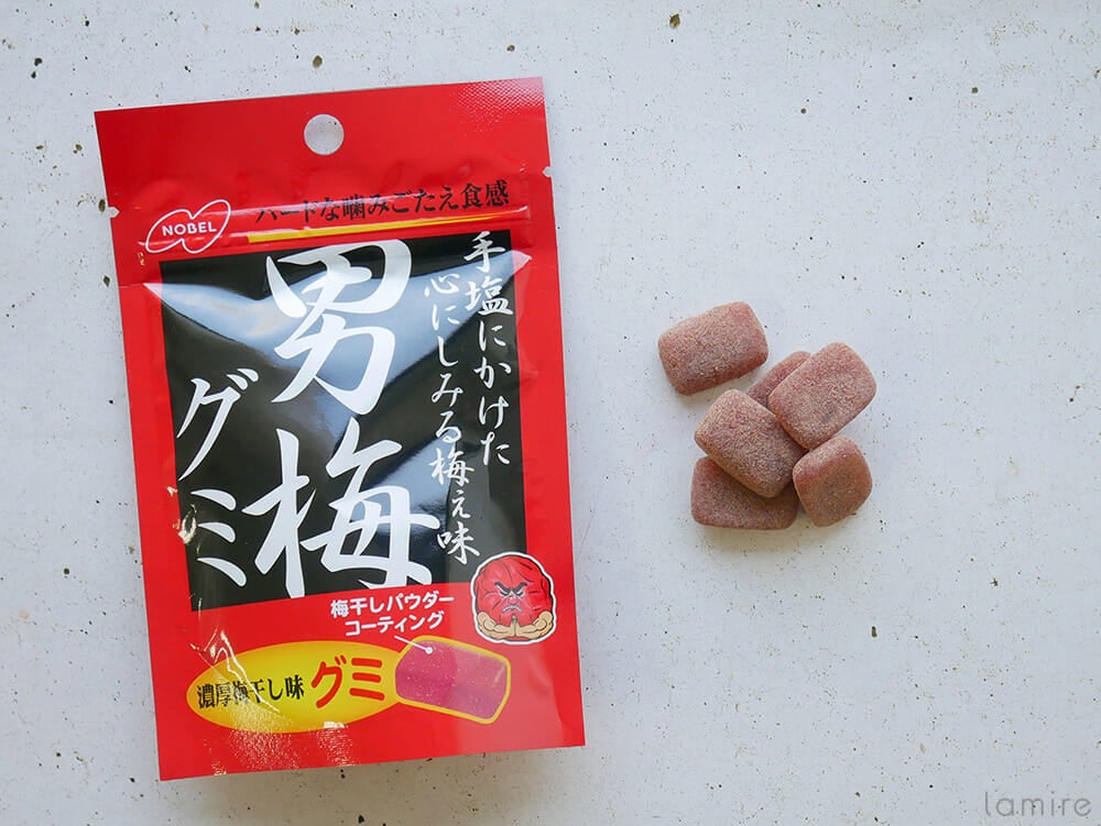 梅好きの間では、定番中の定番「男梅グミ」。あまりのおいしさと抜群の歯ごたえで永遠に噛んでいられちゃう。ちなみに一般的なグミが10秒と持たずに口の中からいなくなってしまうのに比べて、男梅グミは約1分間も噛んでいられました。このグミのポイントは、全体にたっぷりとまぶされている梅干しパウダー。このパウダーが梅感バツグン!