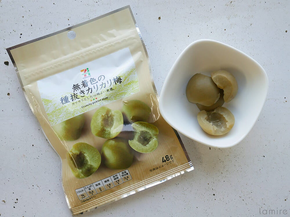 カリカリした食感が最高の「無着色の種ぬきカリカリ梅」もセブンイレブン限定。ほとんど梅そのままの味が楽しめます。梅を半分に切ってあるので食べやすさも安心です。ただ少し袋の中が湿っているので、お手拭きはあった方がいいですね。