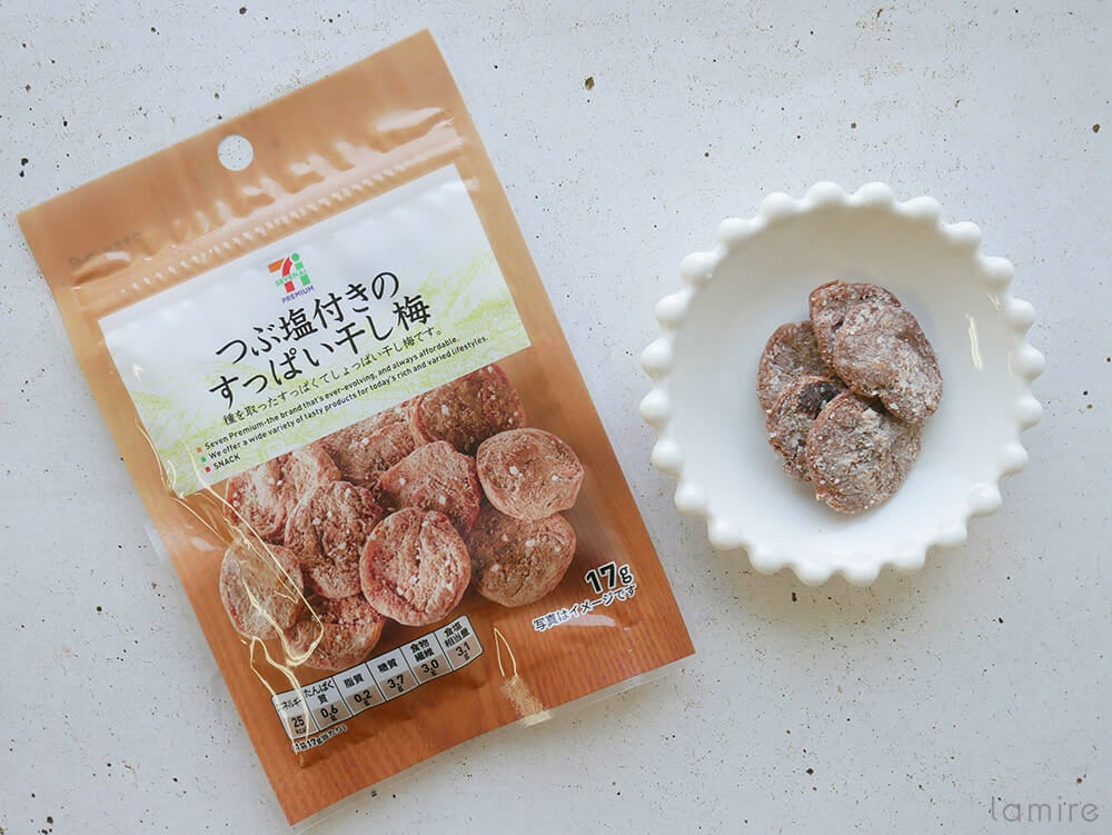 梅のお菓子の中ではしっかりと酸っぱさが楽しめる「つぶ塩付きの酸っぱい干し梅」は、セブンイレブン限定。梅の味わいよりも酸っぱさが先にくるため、すっきりとしたいときにおすすめします。全体に付いている大きめのつぶ塩が、酸っぱさを引き立てるいい役割をしてくれています!食べたときにジャリっとする食感もクセになること間違いなし。