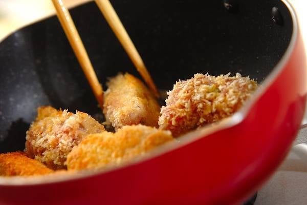3、サラダ油を熱したフライパンに入れ、転がしながら揚げ焼きにする。こんがりキツネ色になるくらいまで、5分ほど火を通す。
