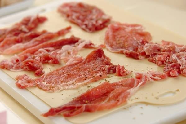 ・豚肉は全体に塩、コショウをふり、8等分に分けておく。スライスチーズは1枚を4等分に、大葉は軸を除き、縦半分に切る。