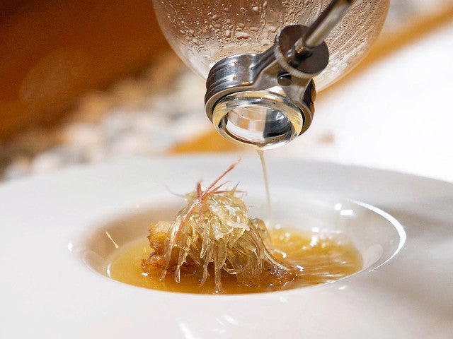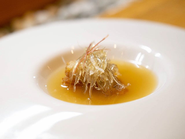 卵を産まなくなった親鶏、豚の赤身肉、龍眼(ロンガン)などで仕込んだスープをサイフォンに通してトリュフなど季節の素材で香り付けしたら、乾燥状態から15日かけて戻したフカヒレに金華ハムをトッピングしたお皿に一気に流し込む(写真上)。
