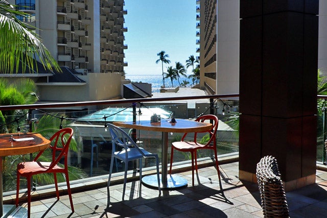 ふと潮の香りを感じて辺りを見回すと、建物の間に海が見えました。日中は青い海、サンセット時には夕日に染まる海を眺めながらカクテルや食事を楽しめるなんて贅沢だなぁ。