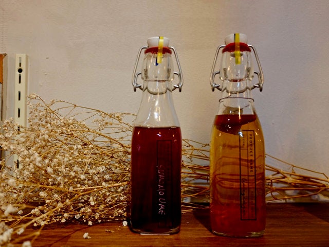 また「ウメすももシロップ」(同・左)は、ごろんとしたスモモの果実入り。華やかな桃のような香りがふわりと広がる、上品なシロップに仕上がっている。