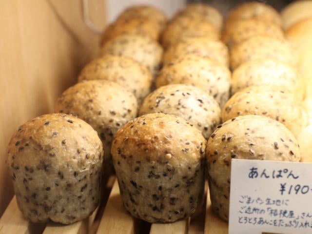 生地は、食パン「パン・ド・ミ」にも使われている湯種にたっぷりのゴマを混ぜたもの。ずっしりと重めで、モチモチした生地は、とろっとした舌触りのあんこと相性抜群だ。