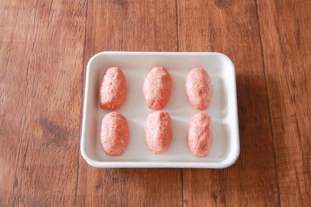 ③ボウルに豚挽き肉、タマネギ、Aを入れて粘り気が出るまで練り混ぜ、6等分にして俵型にする。