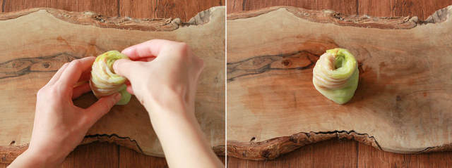 ⑤左側の葉を内側に折りたたみ、隙間がないように最後までくるくると巻く。右側を上にして立て、出ている葉を内側に押し込む。