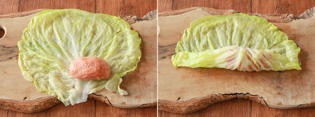④キャベツの水気をキッチンペーパーで拭き取り、茎側が下になるようにまな板に広げる。手前の中心よりやや右側に鮭を縦に2枚並べ、その上に③を置き、キャベツを手前からタネに密着させるように一巻きする。
