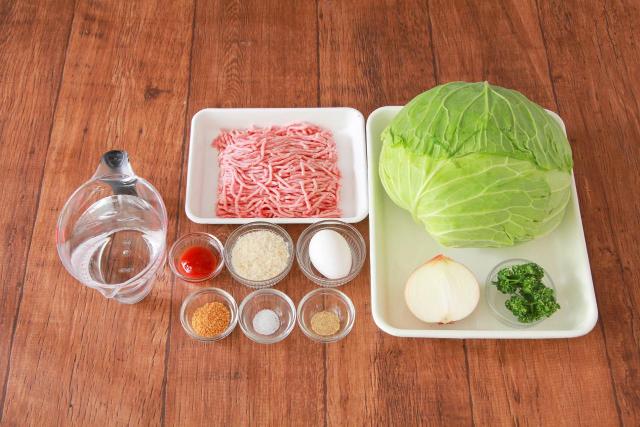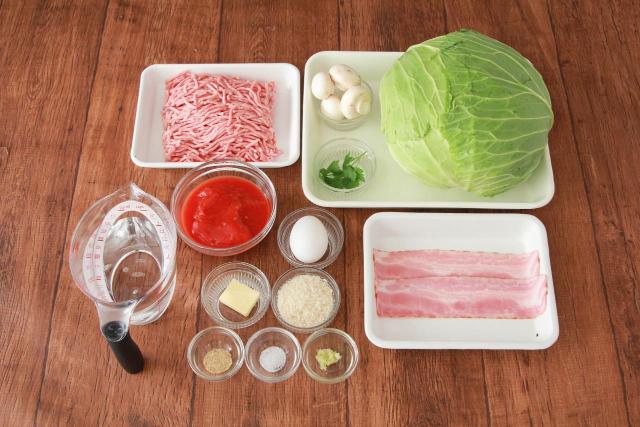 ①キャベツはふんわりラップで包んで600Wの電子レンジで葉が柔らかくなるまで5分加熱する。ラップをはがしてキャベツの芯を包丁でくり抜き、茎側から外側の葉をキャベツの丸みに沿ってはがす。マッシュルームはみじん切りにし、ベーコンは1cm幅に切る。