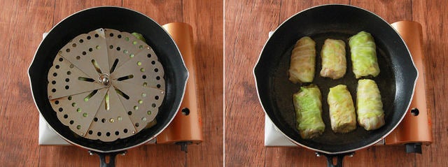 ⑥フライパンに牛乳、生クリーム、顆粒コンソメを入れて中火で熱して⑤を並べ、沸騰したら落し蓋をして弱火でキャベツがやわらかくなるまで30分程煮る。