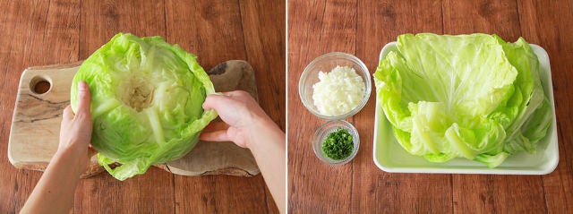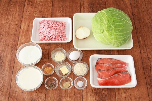 ①キャベツはふんわりラップで包んで600Wの電子レンジで葉が柔らかくなるまで5分加熱する。ラップをはがしてキャベツの芯を包丁でくり抜き、茎側から外側の葉をキャベツの丸みに沿ってはがす。タマネギはみじん切りにし、鮭は3等分に切る。