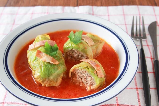 素材のうまみがたっぷり「きのことベーコンのトマトスープロールキャベツ」
