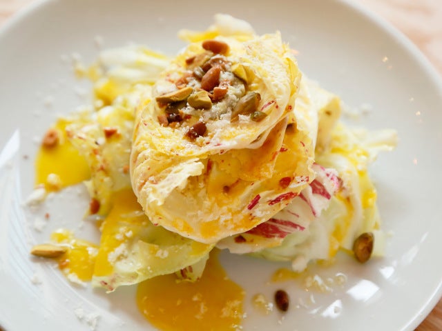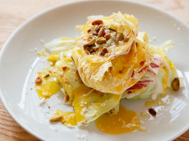 寒さ厳しい今の時期におすすめの前菜は、「カステルフランコとゴルゴンゾーラのサラダ みかんのドレッシング」(写真上)だ。カステルフランコとは、バラの花のような見た目のイタリア野菜。この葉っぱ一枚一枚にゴルゴンゾーラとマスカルポーネをクリーム状にしたものを塗り付けてお皿に盛り、ピスタチオと松の実を散らしたら、みかんを皮ごと使って作ったドレッシングをたっぷりとかけて完成だ。