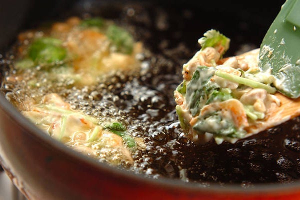 3、(2)をひとくち大ずつ木ベラにのせ、170℃の揚げ油でサックリ揚げる。