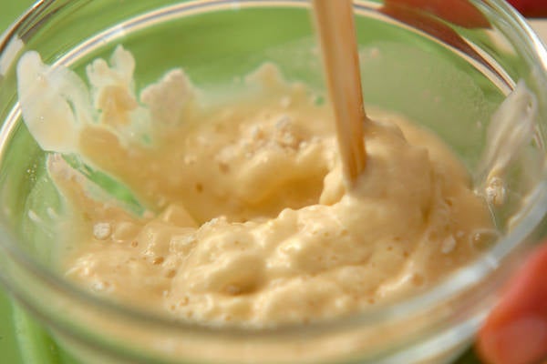 2、(1)に<衣>を加え、均一になるように混ぜ合わせる。
