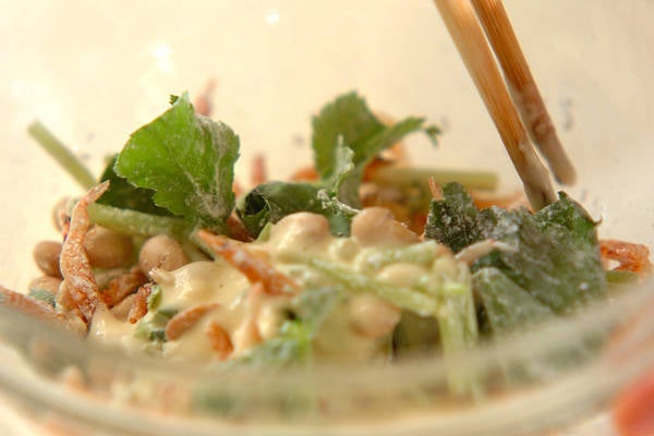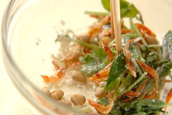 1、ボウルに大豆、干し桜エビ、ミツバを入れて混ぜ合わせる。さらに天ぷら粉を加えて混ぜ合わせる。