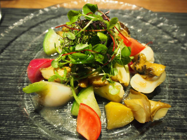 産地や旬の説明をしてもらうことで会話のネタにもなるし、この会話の中で、ボリューム、好き嫌いの食材なども解決できる。この日、前菜の2皿目は魚介と野菜の組み合わせ。瀬戸内のサザエがあると聞いて、これに冬野菜を合わせての冷製サラダ(写真下)をオーダーした。