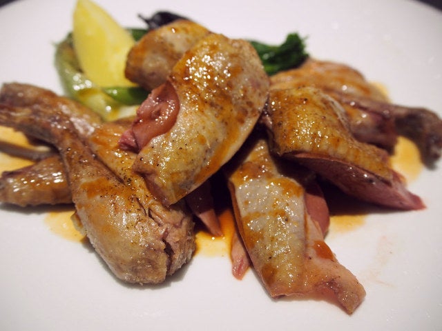 メインで選べる肉が3種。その中から鳩(写真上)を選ぶ。思い切って1羽オーダーしたが、ハーフポーションでもオーダーできるなど、これも相談しながら決められる。さらにシェフが修業した場所は南仏からブルゴーニュ、アルザスと幅広く、それぞれのスタイルを生かした多彩な表現も彩りを加えてくれるから、おまかせながらもコミュニケーションの中で2人にとって気分の良いものに寄り添ってくれる。