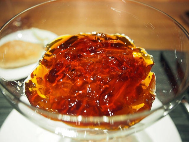 冷製と書いたのは希望すれば温野菜にもできるというありがたい変更が可能だから。ちなみにこのサザエや野菜の中のいくつかは加藤シェフが訪問した現地の漁師や生産者から直接入手したもの。一期一会的な出逢いで入手した食材というのが、また気分を盛り上げてくれる。