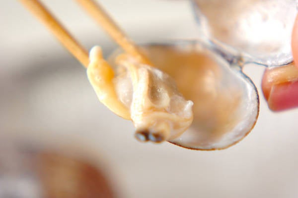 ・アサリは分量外の塩水で殻と殻をこすりあわせる様に洗い、ザルに上げる。