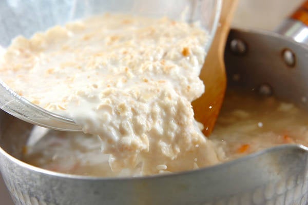 1、鍋に牛乳とアサリを入れて強火にかけ、アサリが開いたら火を止め、キッチンペーパーでこし、殻からアサリの身を取り出しておく。こした牛乳にクラッカーを加える。