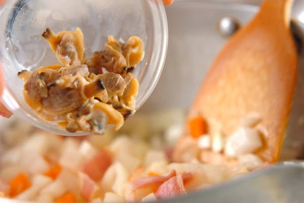 2、鍋にバターを入れて中火にかけ、ベーコンを炒める。ベーコンから脂が出てきたら、大根、ニンジン、玉ネギを加えて炒め合わせる。全体にバターがからまったら、(1)のアサリを加えて炒める。