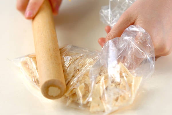 ・クラッカーは抗菌のビニール袋に入れ、麺棒等で細かく砕く。
