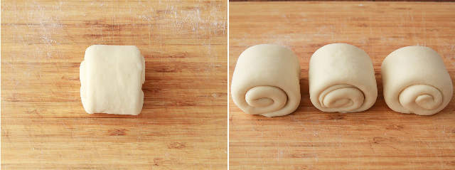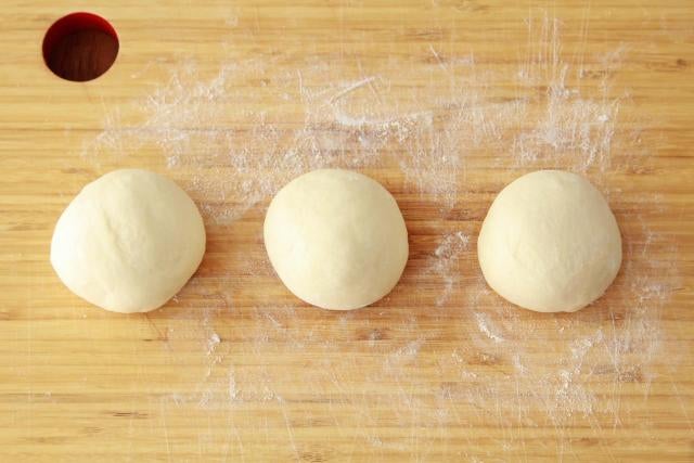 ④ まな板に打ち粉(分量外)をして生地をのせてガスを抜き、3等分に切り分ける。表面にハリが出るように丸めてとじ目を下にまな板に並べ、濡らして水気を絞ったクッキングペーパーをかぶせてラップをし、20~25℃の室温に生地がひと回り大きくなるまで約20分置いて休ませる。