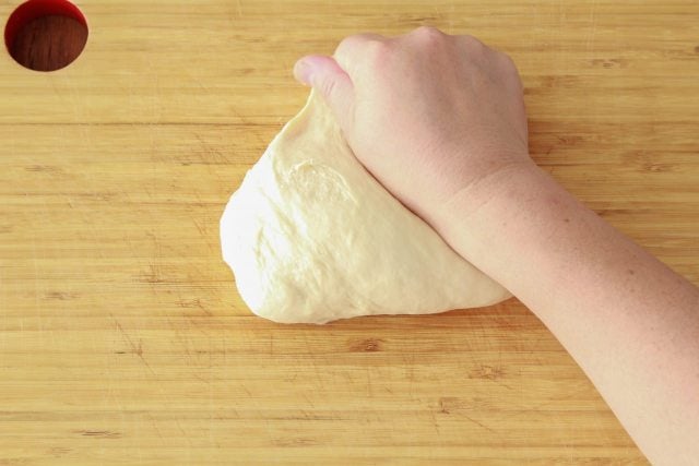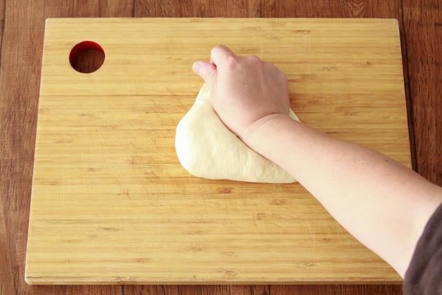 手のひらで押し付けるようにしながらムラなくこねることで、生地がやわらかくなり発酵しやすくなる。生地表面にツヤが出てなめらかになるまで、10分ほどしっかりこねよう。