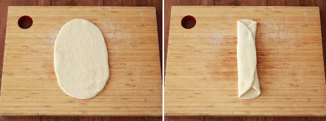 ⑤ 生地をめん棒で楕円形に伸ばし(縦20cm×横13cm)、左右の1/3を中央で重ねるように折りたたむ。