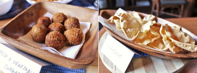 そして、豆ではなく小麦粉のみで作られた煎餅のような「パパダム」(同・右)をご飯に立てるように添えたら、いよいよマイプレートの完成だ。