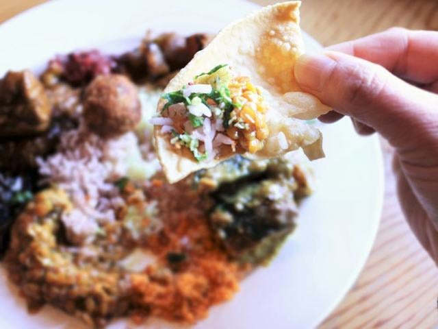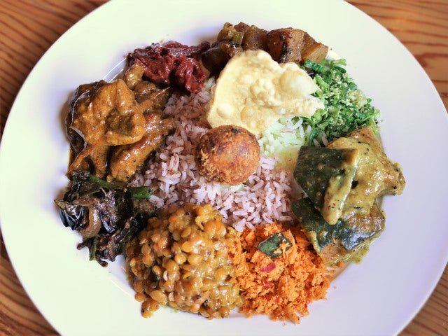 「お肉を使う料理は1種類だけで、ほとんどが野菜だけなのです」と、店主のバンダラさん。少しずつ盛り付けると、栄養バランスも良く、健康的なランチになる。