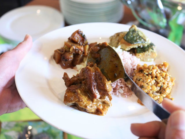 皿を手に取り、ライス、メインのカレー、副菜的なスパイス料理を盛り付けていく。盛り方にもちろん決まりはないが、スリランカでは皿の中央にライスを置き、その周りをカレーやスパイス料理で彩るのがメジャーなスタイルだ。さっそく盛り付けていこう!