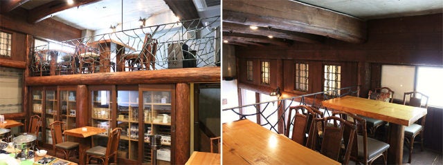 エントランスから入るとすぐにオープンキッチン&カウンター席があり、左へ進むと木造りの落ち着いたダイニングルーム、右へ進むと中庭が広がる。木をふんだんに使ったダイニングルーム(写真下・左)は吹き抜けで天井が高く、中二階にも客席(同・右)があり隠れ家的な雰囲気が漂っている。