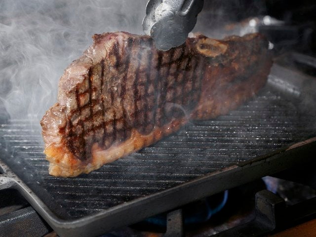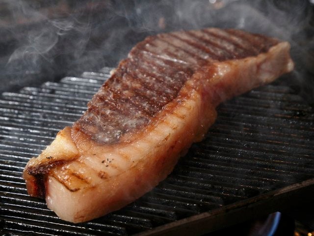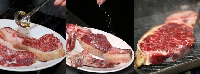 あらかじめ十分に熱したグリル板に肉をのせるとジュージューとおいしい音とともに一気に煙が立ちあがる。1/3ほど火が入ったところでひっくり返す。少し時間をおいて肉を180°回し熱を均一に通す。