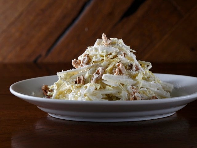 河村シェフの一品料理はパリ仕込みの本格派。「サラダ・白菜とくるみ」(写真上)は赤ワインビネガーと生クリームで白菜とくるみを和え、パルミジャーノチーズをパラパラと振りかける。酸がまろやかで箸が進むと人気の一品だ。