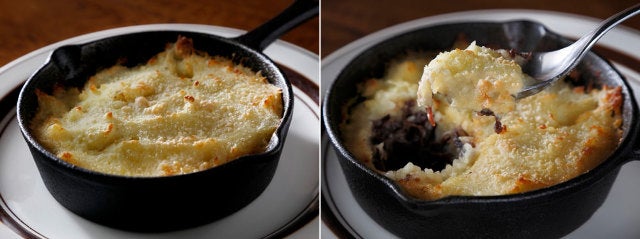 余った“端っこ肉”を赤ワインでじっくり煮てコンビーフ状にし、ジャガイモのピューレで表面を覆ってオーブンで色目がつくまで焼くと、シェフがパリにいた頃から作っていた「アッシェパルマンティエ」(写真上)ができあがる。しっかり味のしみ込んだ肉と優しい味わいのジャガイモとのピューレの組み合わせ、素朴なビストロ料理がワインにぴったり。