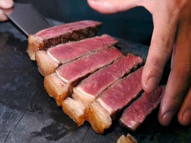 焼き時間は当然のごとく“勘”に頼るしかない。焼きあがった肉を食べやすい大きさにカットして中心の肉を横にする。シェフにとって緊張の瞬間だ。美しくロゼ色に仕上がった肉を見て初めて安堵すると言う。
