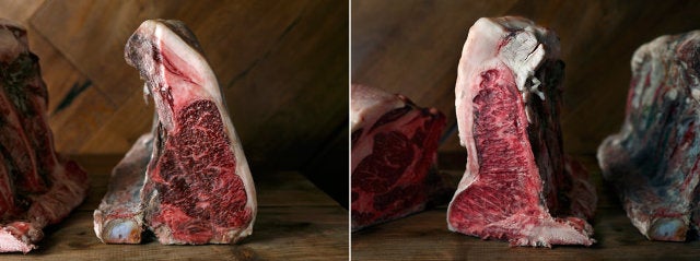 同じサーロインだが食べ比べてみるとそれぞれの特徴が明確になる。熟成肉(写真上・右)はナッツ香を纏(まと)った脂が溶けながら力強い肉質を覆い、味の層が一体となる。反対に近江牛(同左)は脂が肉に負けじと主張してくる。あれだけ火を入れたのに溶けることなく厚みもしっかり残っている。しかし味はクリアでとても脂を食べているとは思えないのである。これは脂好きにはたまらない。