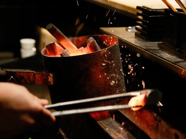 過ごしやすい客席とは打って変わり、焼き場では轟々(ごうごう)と炎が立ち続けている。使用している炭は和歌山県産紀州産の備長炭のみ。