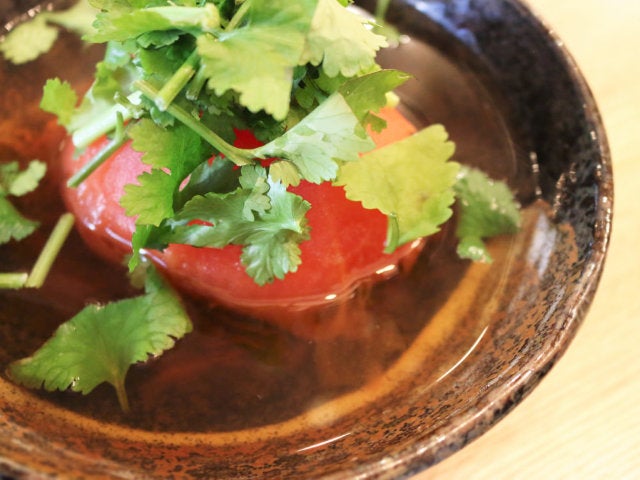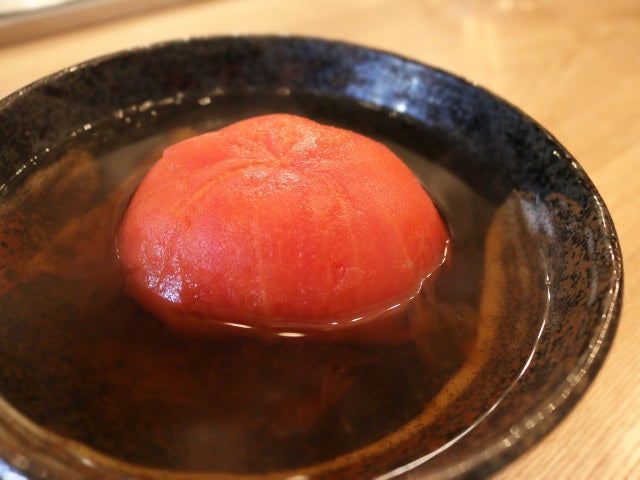 『日和』では、大根や玉子など王道のおでん種以外に、季節の食材や変わり種など、特別なおでんを3~4品ほど用意している。中でも人気は、「トマト」のおでん(写真下)。