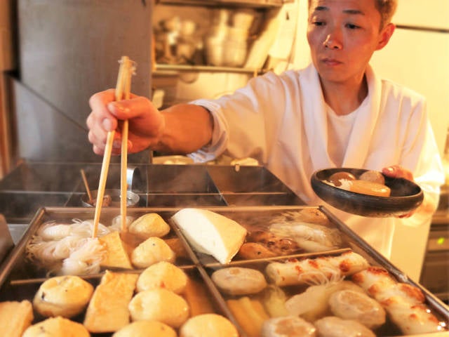 おでんはそのままでももちろん、自家製からし酢味噌をつけるとまた違った味わいが楽しめる。「和がらしだと強すぎるので」という望月さんの言葉通り、ユズなどの柑橘系が入っていて何とも優しい味。丁寧に煮込まれた具材との相性もバッチリで幸福感に包まれる。