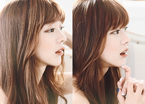 1.前髪を半分持ちあげて、内側に軽くスプレー