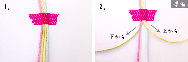 2. 中央の2本を外側に出す。(左側は下から、右側は上から)