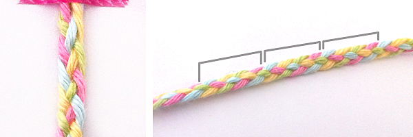 外から内への動きを左右交互に繰り返す三つ編み感覚で、四つ編みを編もうとすると混乱してしまいます。四つ編みは編み始める準備をしたら、「一番左を右側へ」と覚えましょう!