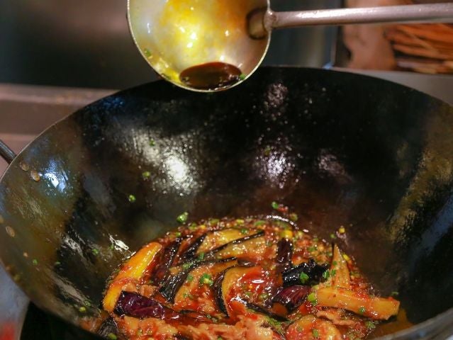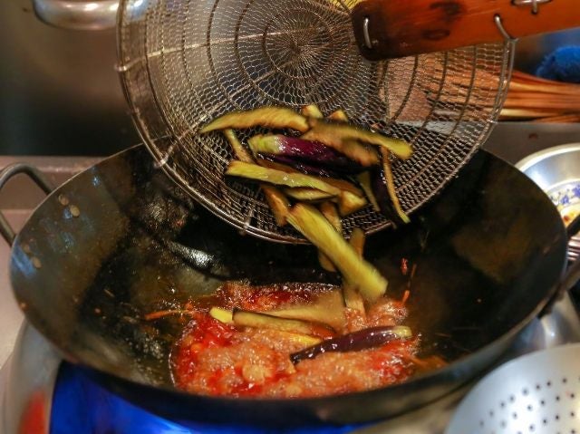 日本でおなじみのメニューが、実は本場ではちょっと違う、ということがよくあります。四川では、本来豆板醤を使わず、その昔生きたフナを入れて発酵させる“唐辛子のピクルス”を用いたという、肉を入れずにナスのみで作る「魚香茄子」が「麻婆茄子」にあたります。