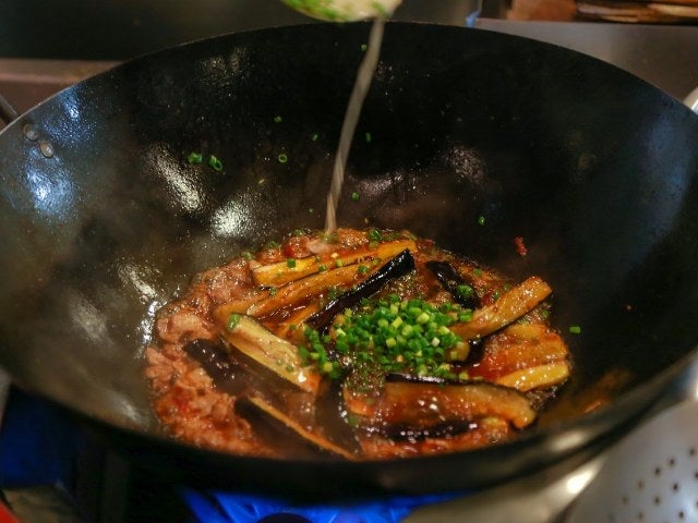 「豆板醤は、火を入れないとただ辛いだけの調味料なので、焦げる手前まで炒めることで香りを立たせます。そして最後に黒酢を加えると、調味料の甘みと辛みがひきしまり、油っぽさも感じないんですよ。この味付けを“魚香(ユイシャン)”といいます、中国の人々が大好きな味です。」と井桁シェフ。食べてみると、まさに仰る通り! 香り高く、辛みと甘みのバランスが絶妙な一品でした。